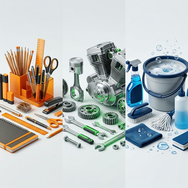 Resmas, cuadernos, carpetas, bolígrafos, marcadores, libros contables y consumibles de oficina.
